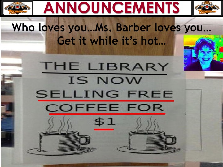 I can’t tell you how many people ran into the library waving their dollar for a “free” coffee. Students and adults came, which made my pranking teacher laugh even harder. I decided that my newly installed Tiger’s Tissue Tabloid would respond in kind. I can’t tell you how long we went back and forth but the epiphany was when the bookkeeper mentioned in passing that she looked forward to the joke every Monday. The coffee jokes became the staple of the year and even teachers who did not drink it, enjoyed the “inside” joke.