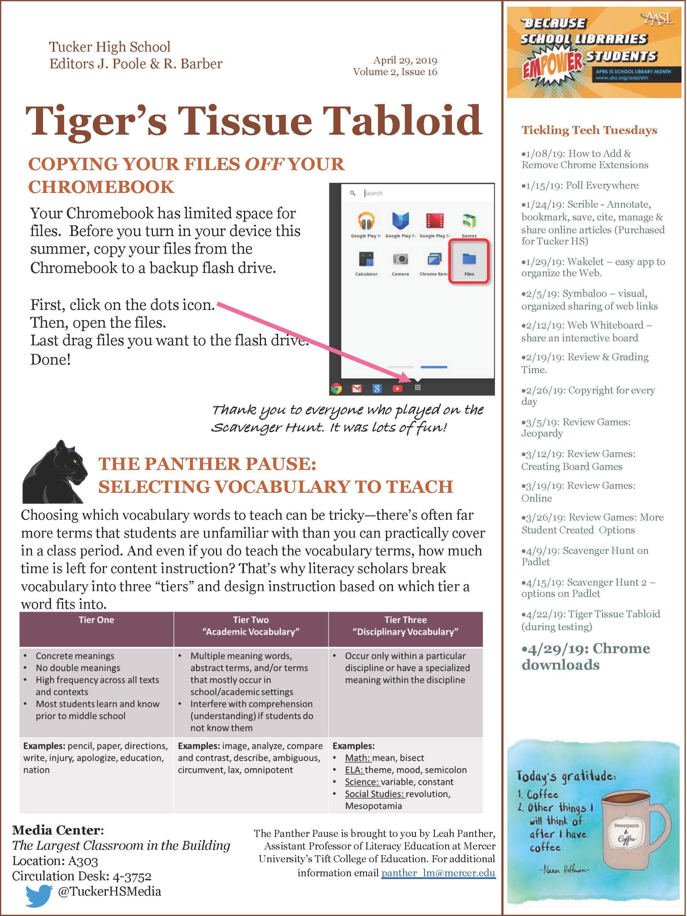 The second big thing that happened was in January, a new professor at a nearby college, wanted to help teachers with literacy. She joined me in the Media Center on Tuesdays with the idea that teachers came to see me for #TicklingTech and they could see her too. It worked! Teachers did come in for their mini-lesson but often stayed to talk to the professor about ways to incorporate literacy. I had already transformed (multiple times) the Tissue Tabloid from three technology hints to one. We decided to scrunch up the tech hint and provide space for the literacy lesson. Only you can decide if it works. And, yes, we’ll do another round this coming school year, with a new joke and a hope to engage with teachers – in any way that works.