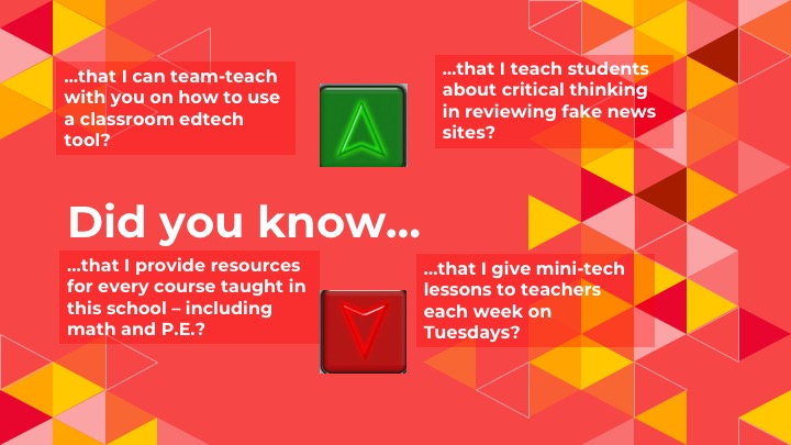 WAIT!! STRANGERS?! No, teammates! Instead of just thinking of this as just advocacy, think of this as COMMUNITY BUILDING. Because what you are really doing is inserting yourself into the team. Try starting with the phrase “Did you know…” and see where it takes you. Did you know that I provide resources for every course taught in this school including math and P.E.?