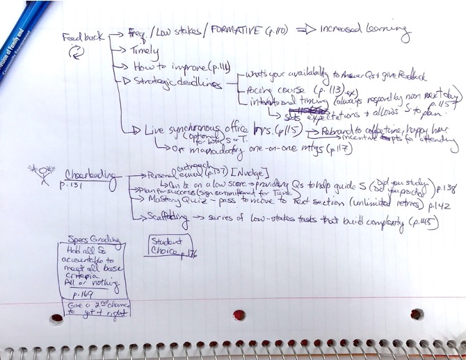 Video use is a big part of online classes and this book addresses that. But here’s my takeaway: If there is not an explicit reason to watch a video – no matter how short it is – students won’t watch (p. 57). Videos need to be tied to the classwork and scaffolded. They don’t hang out there by themselves, but they are part of the learning, feedback, grading, discussion boards, etc. If you have a video, have an assignment – short, low grade value – to get the student to watch the video.