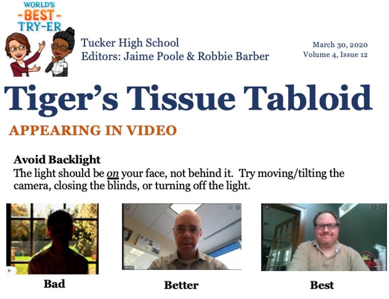 Thanks to information and images from Andy Segal, we included information in our weekly faculty newsletter. (During the pandemic, it was sent via email instead of hanging in the staff bathrooms which explains the name.) In any communication, be aware of what will help the most. In this case, the images showcase the issues of backlighting and framing pretty well.