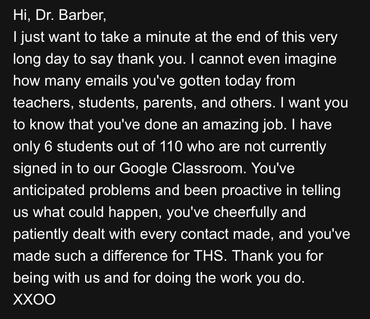 Third, I spent the preplanning week doing two main things. One was teaching teachers how to set up their online classrooms. The other was providing resources. But in this case, resources does not necessarily mean handing them a book. Instead, the resources are often people. I gathered information about which faculty members knew which systems best. Then, when I received a question about a software that I didn’t know well (or couldn’t use as a Media Specialist), I replied and cc’ed another teacher saying, “I don’t know the software but Ms. X does. If she doesn’t have time, please let me know and I’d find someone else to help.” The result was building a database of resources and trying to teach teachers to simply ask.