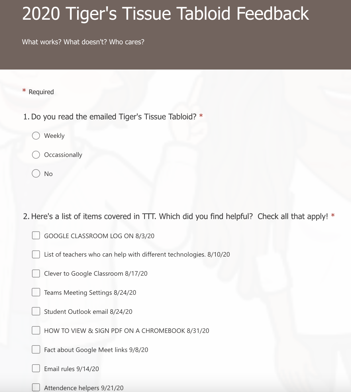 Every semester I send out a form to teachers to ask if the weekly newsletter and TicklingTech Tuesday is helpful or not. I make it easy and give them a weekly summary to find out what was useful. Last year, when we were all remote, I got a whopping 33% return on surveys. (Normal surveys hope for 8-10%.) I use that information to inform my next semester.