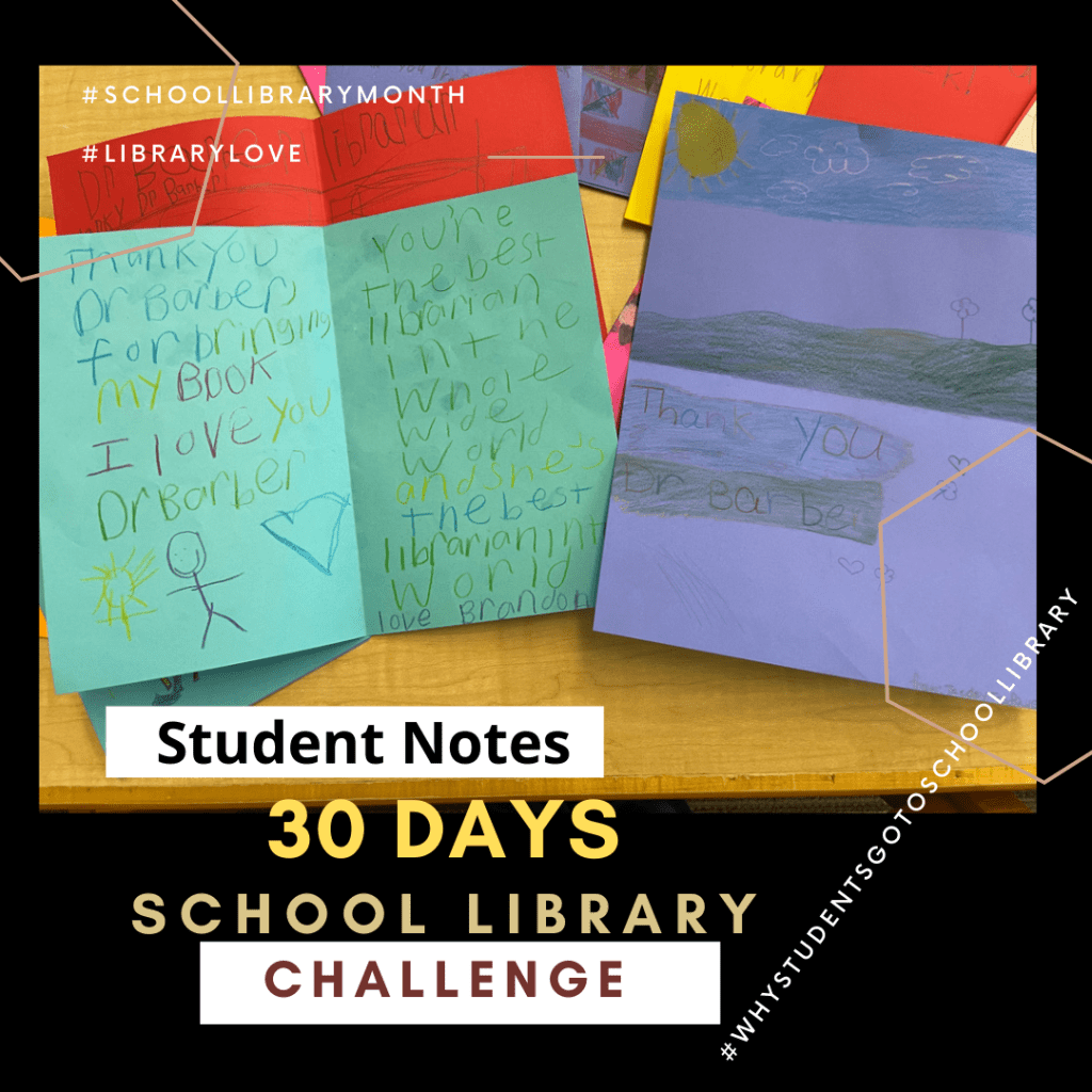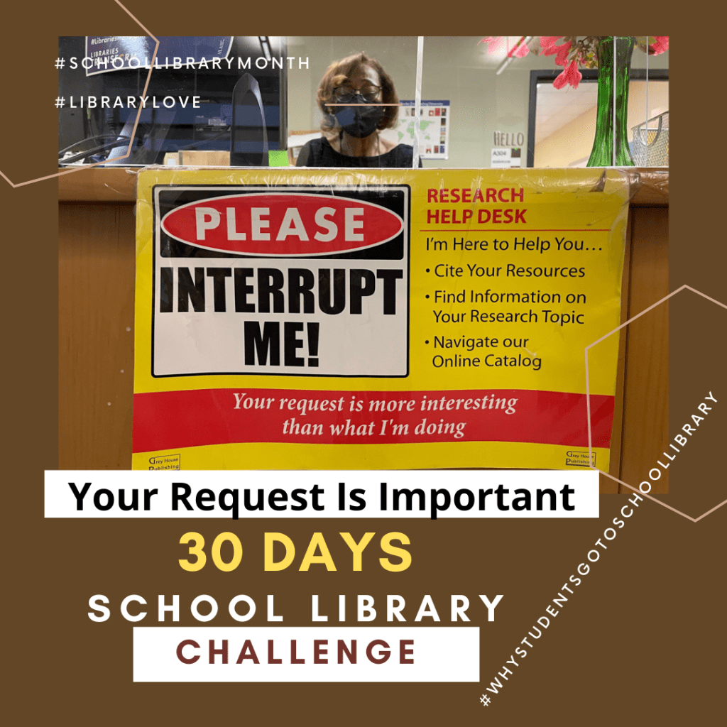 Another view of the 30 Days of April Instagram is shown here in this PDF. Why do you go to the library? Isn’t it worth your support, instead of condemnation? Pause and think about what your school library can do for your child. In 2018, the article “Why School Librarians Matter: What Years of Research Tell Us” by Lance & Kachel, states, “Reading and writing scores tend to be higher for all students who have a full-time certified librarian, and when it comes to reading, students in at-risk subgroups tend to benefit more than all students combined.”