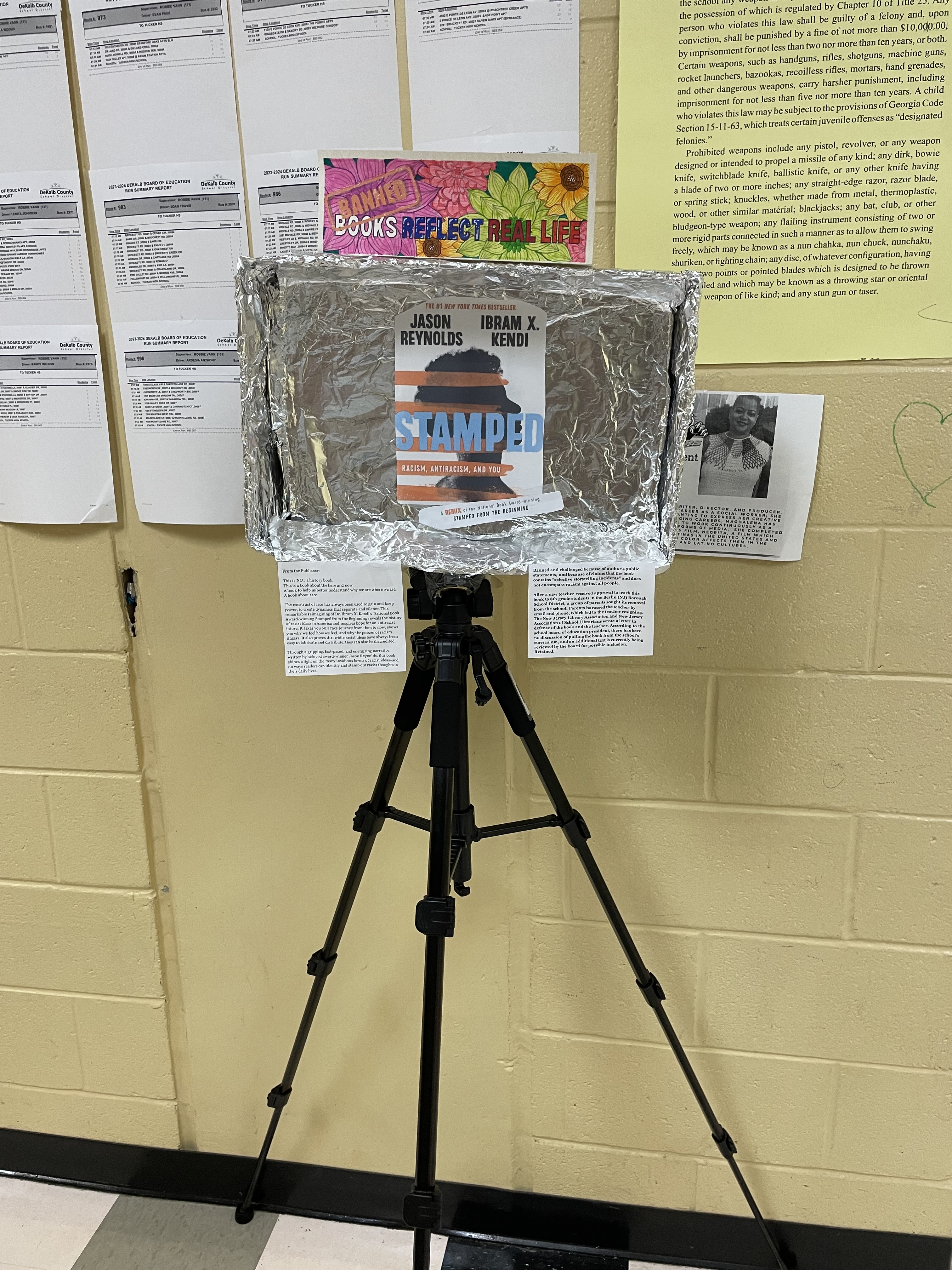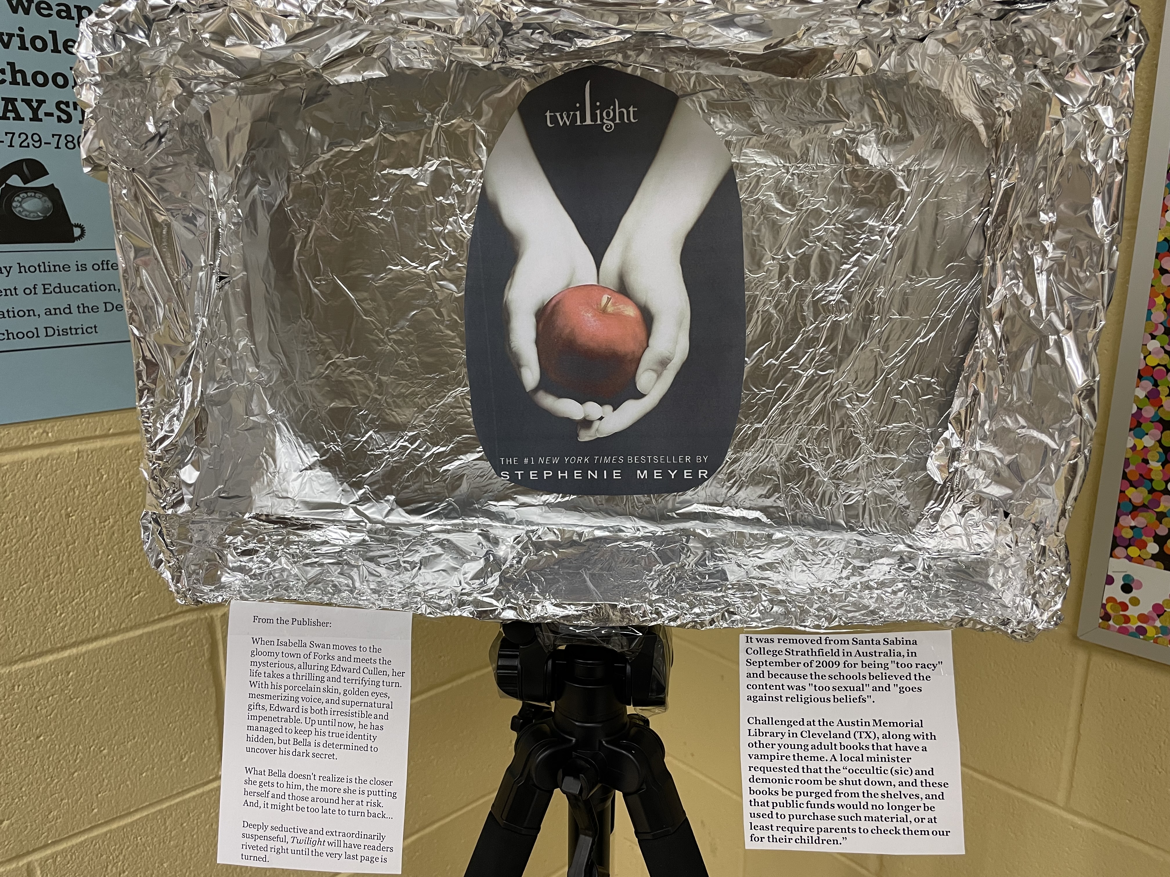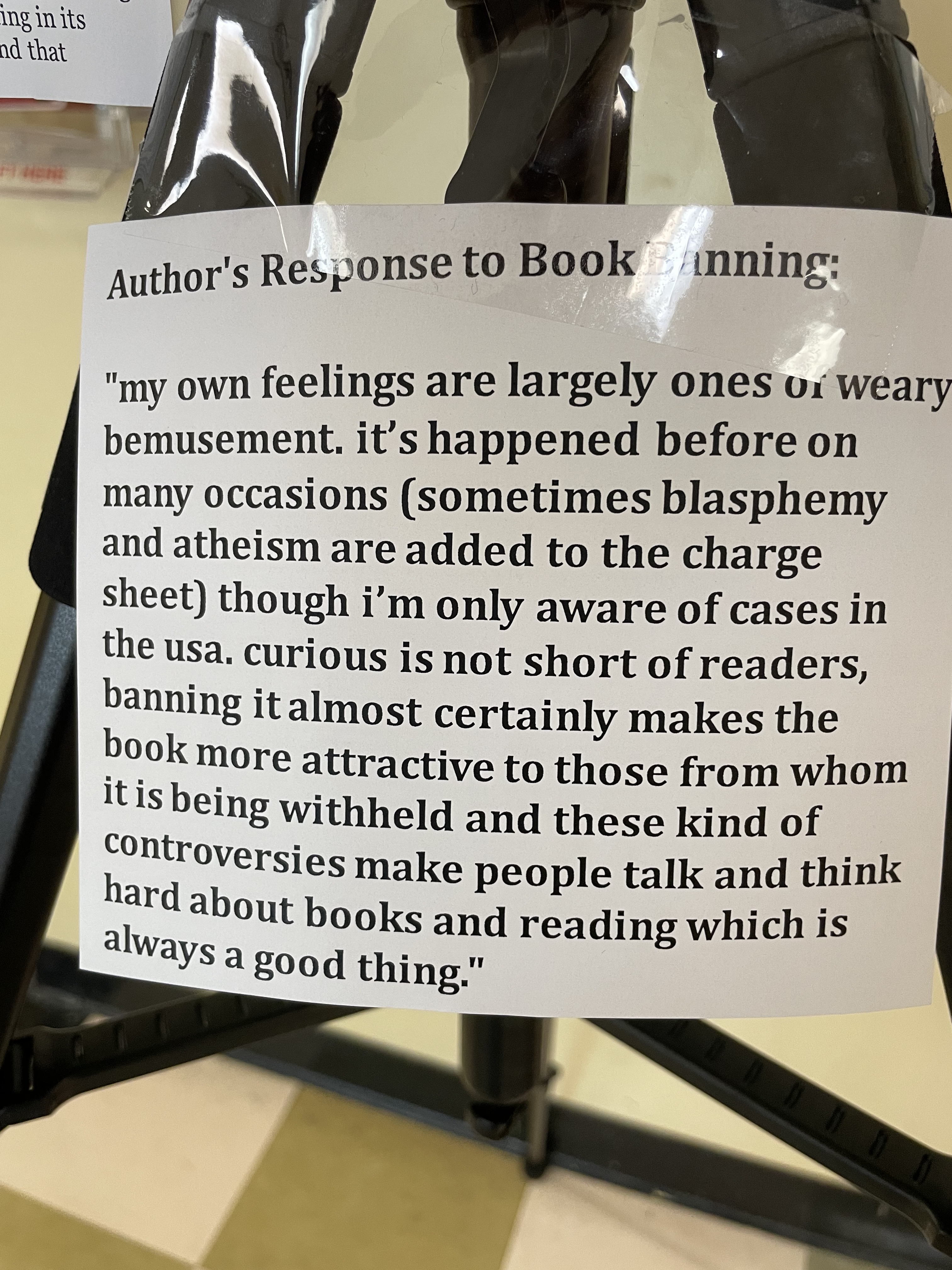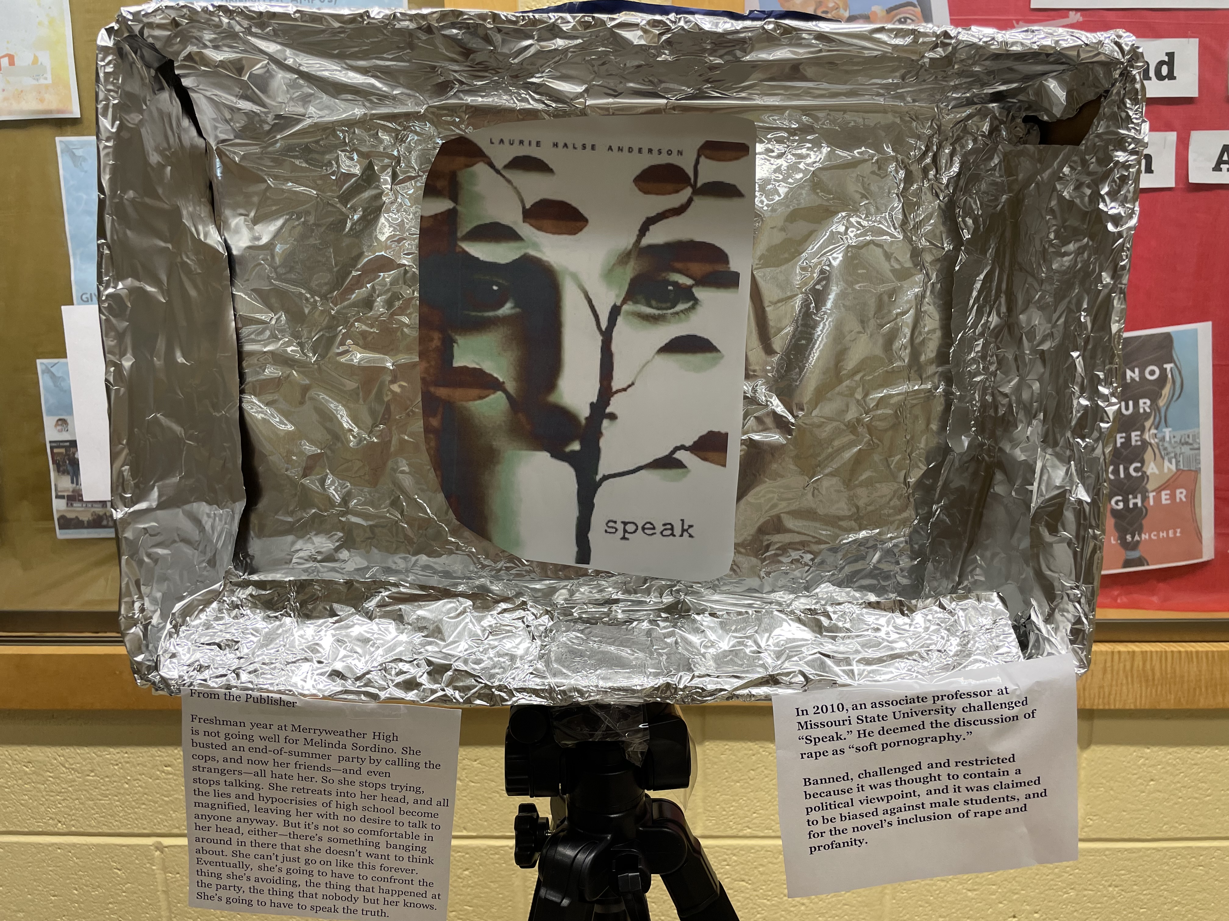 My high school students created a banned book display with the slogan “Banned Books Reflect Real Life“. While LGBTQ+ books are most often banned, we mostly avoided those in the display to show other books that face banning. On one side is the publisher’s description. On the other is a selection of reasons it was challenged. For the book The Curious Incident of the Dog in the Nighttime, by Mark Haddon, we added Mr. Haddon’s response to banning books.
