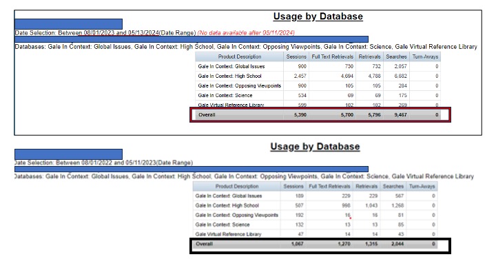 The number of student classes I taught grew dramatically (Mid-Year Report). While I cannot see statistics for all the databases we use, I can see the statistics for the ones I pay for. I wanted to see if teaching more classes translated into higher use of the databases. The answer is yes. The sessions increased by almost 300% and the searches increased by over 450%. I presented this as part of the proof that having a full-time aide directly impacts student learning.