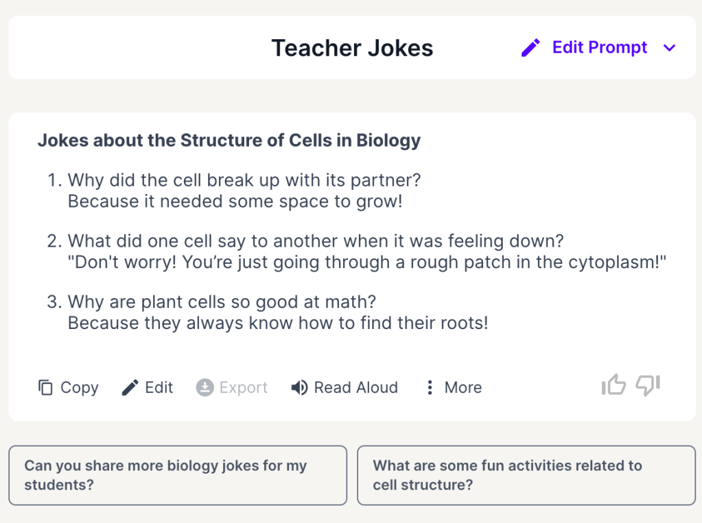 I recommend that my teachers read through the Educator’s Guide for What is AI? in “Day of AI” Curriculum. Second, I will focus on bite-size pieces of AI while always emphasizing the need to know about bias and editing for what you need. I recognize that when the start of the school year rushes in, most teachers are not looking for new items. Instead of lecturing or bombarding them, let’s do something fun. I will introduce them to Teacher Jokes in MagicSchool.AI.