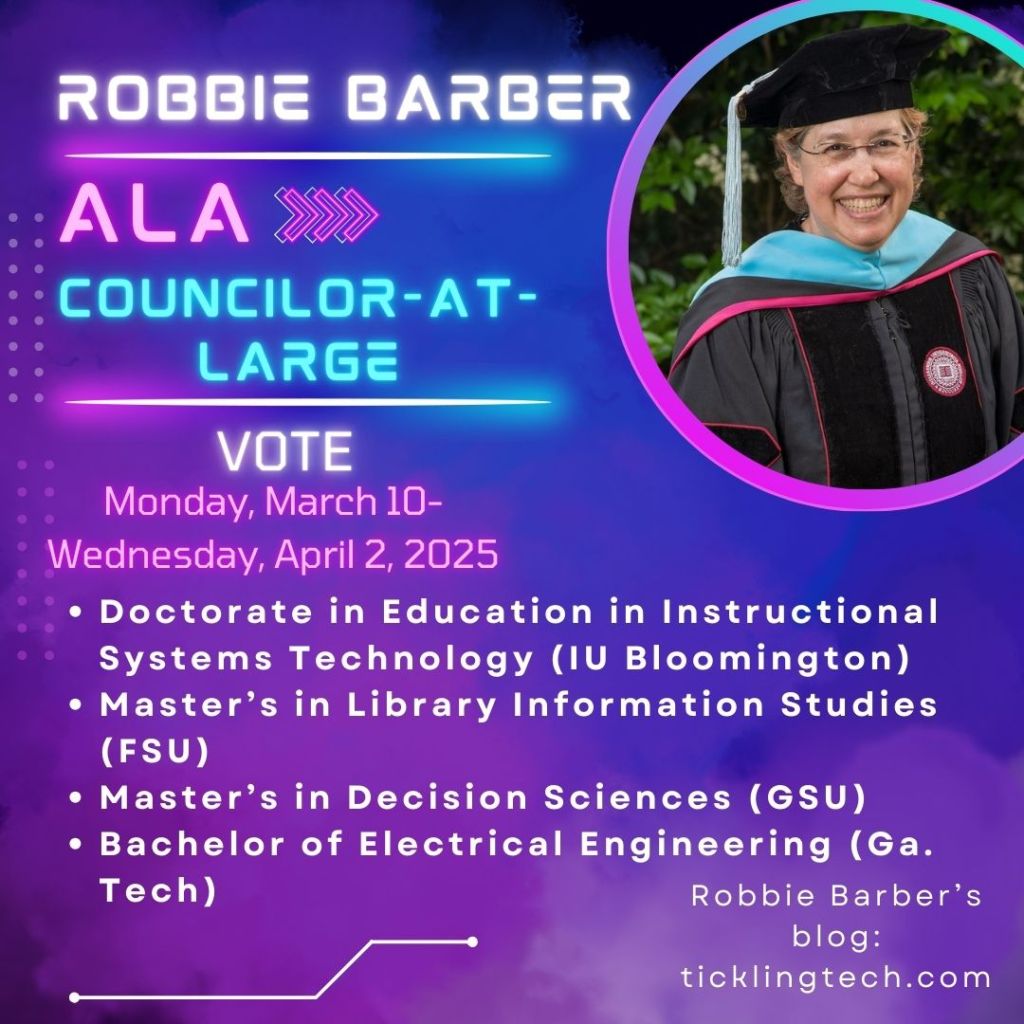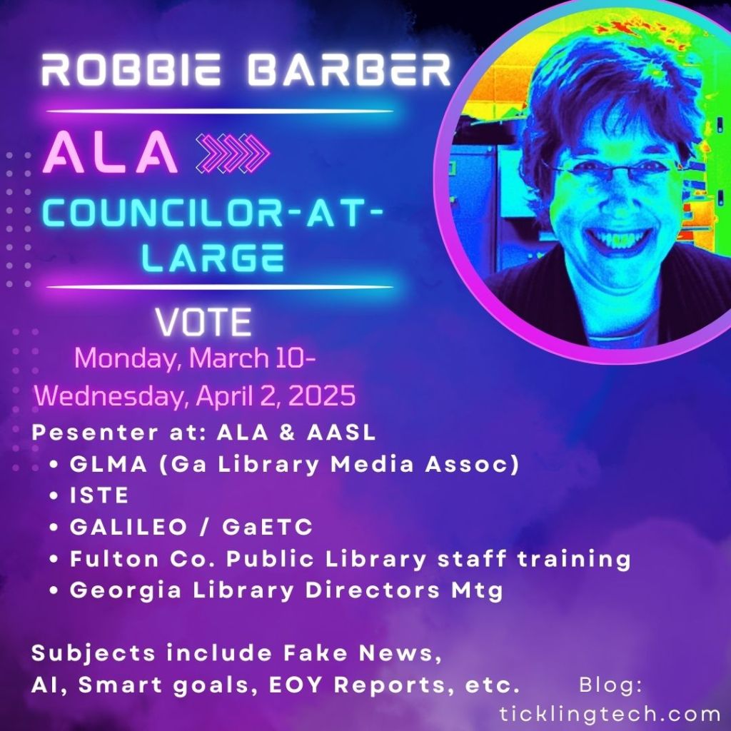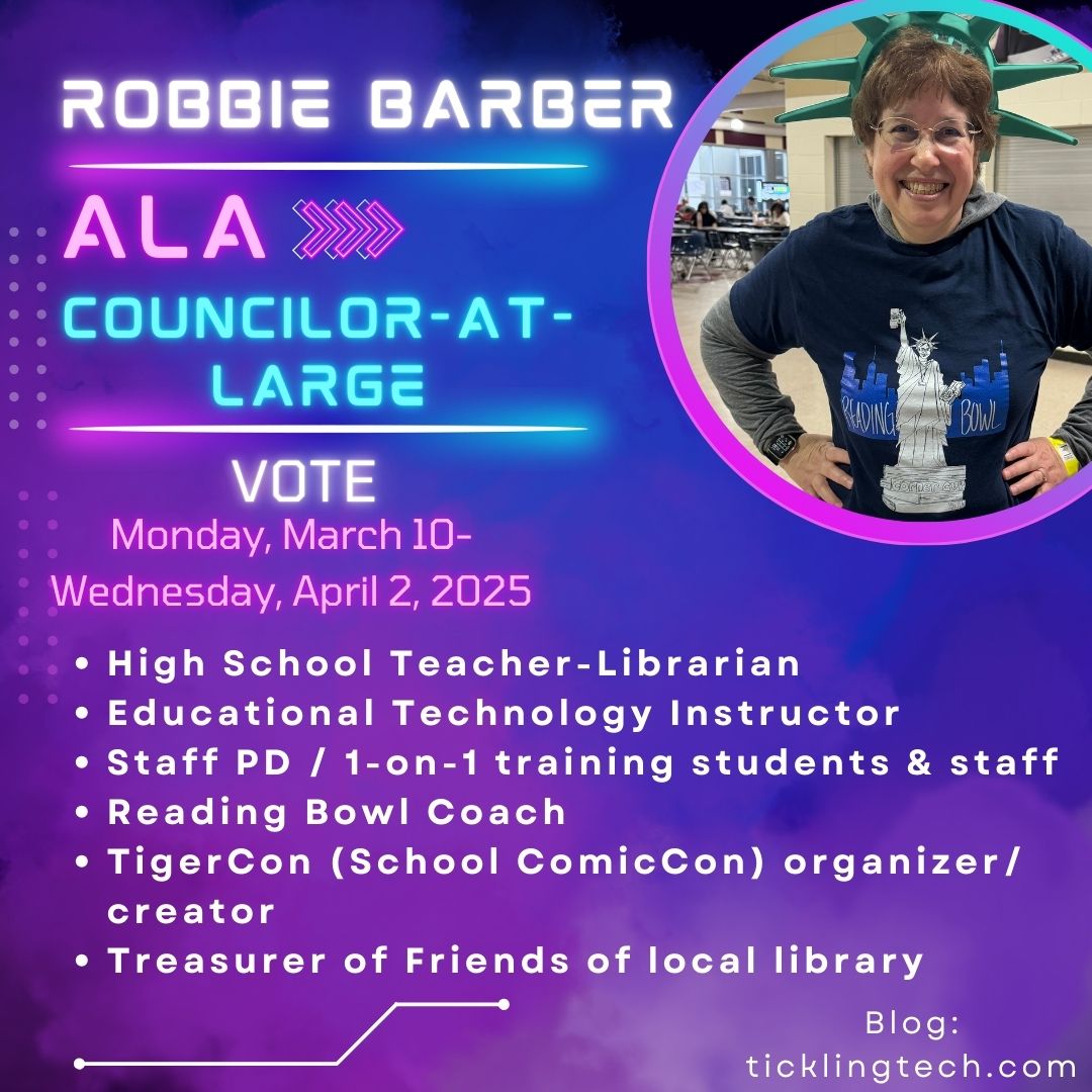 I am running for American Library Association’s Councilor-At-Large this month. (Voting is March 10-April 2, 2025.) I want to help my national organization and I bring experience with school libraries, public libraries as a member of the local branch’s foundation, and in collaboration with state librarians.