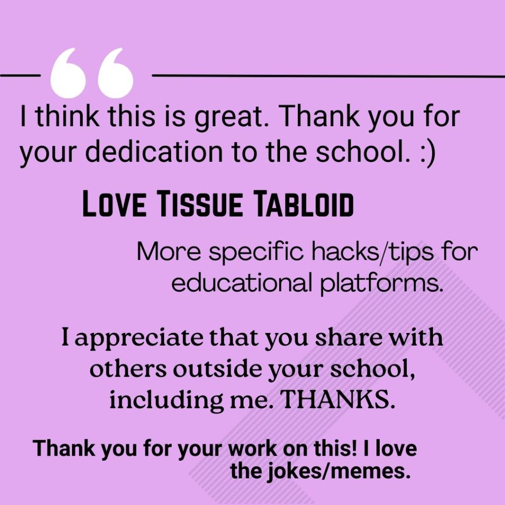 Since August 2018, I have created (with teacher support), a weekly newsletter offering help with technology and/or the library. The original concept was to hang them in the staff bathrooms. In March 2020, it switched to email. In August 2020, I switched back to printing and hanging in the bathrooms and the teachers complained loudly. Now, it’s emailed at 7:30 a.m. every Monday morning during the school year and printed for staff bathrooms. The Tiger’s Tissue Tabloid has covered items like using school software; how to effectively use software like Chrome, Canvas, and Canva; suggestions for organizing wires around your desk; how to set your camera for remote (lighting and appearance); and even Finals Week Bingo for teachers to earn silly prizes. The ideas each week are often provided by teachers in the school. The newsletter has gained some notoriety so that when teachers leave the building, they request copies be emailed to them at their new location. There are a few district-level coordinators who also ask to receive a copy.